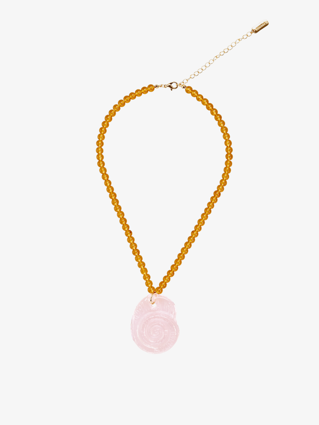Collar regulable con piezas de resinas color ámbar y una caracola de color rosa en el centro.