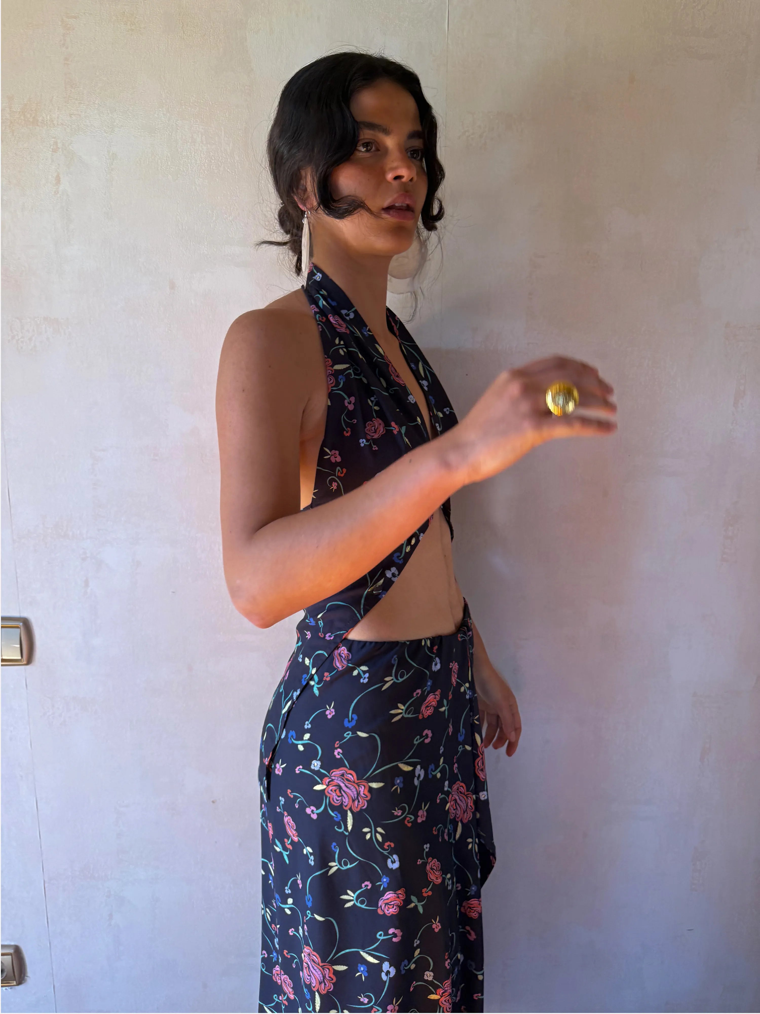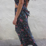 Gonna lunga e svasata blu navy, con vita elasticizzata e spacco centrale con dettaglio a balze, con stampa floreale.
